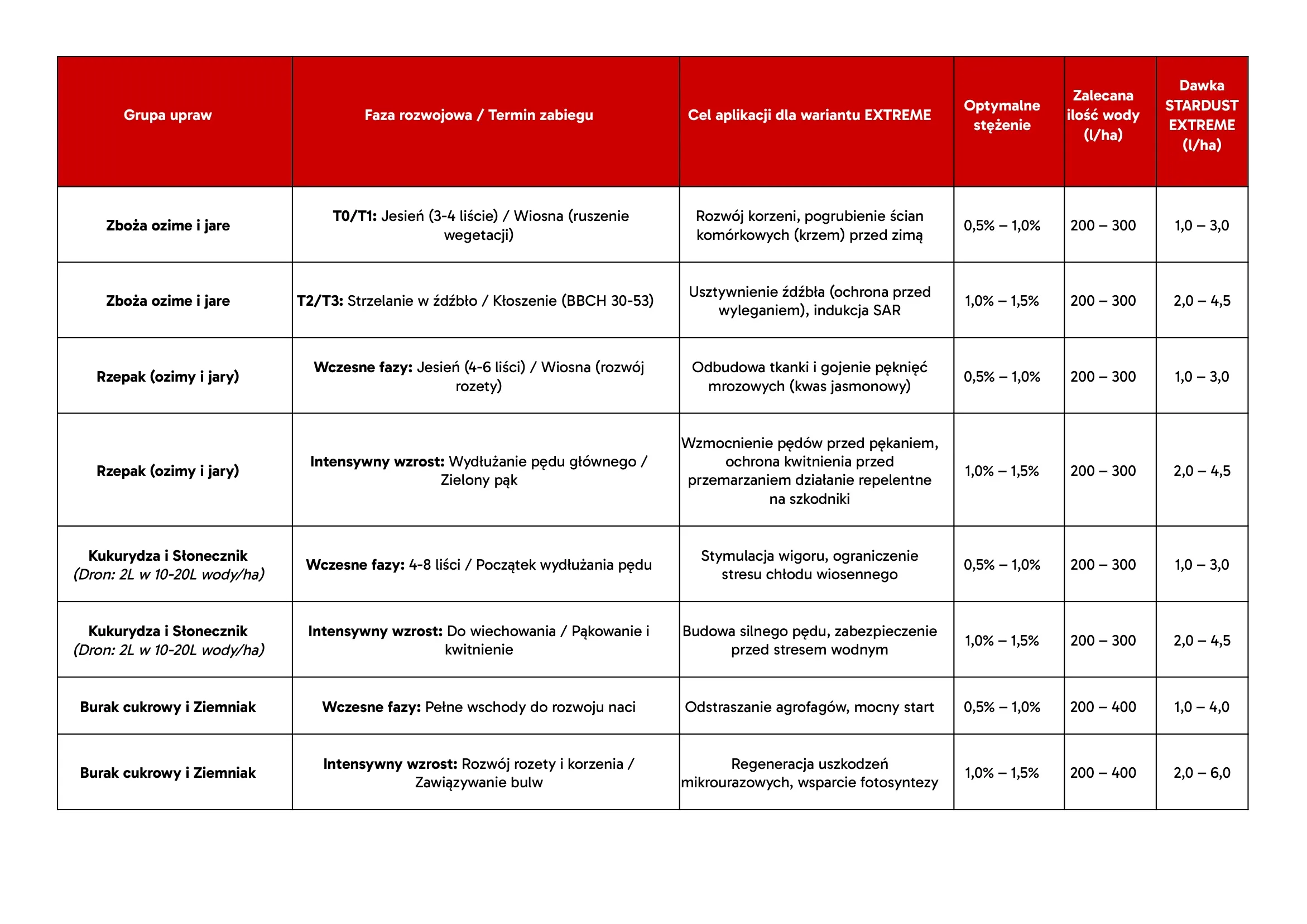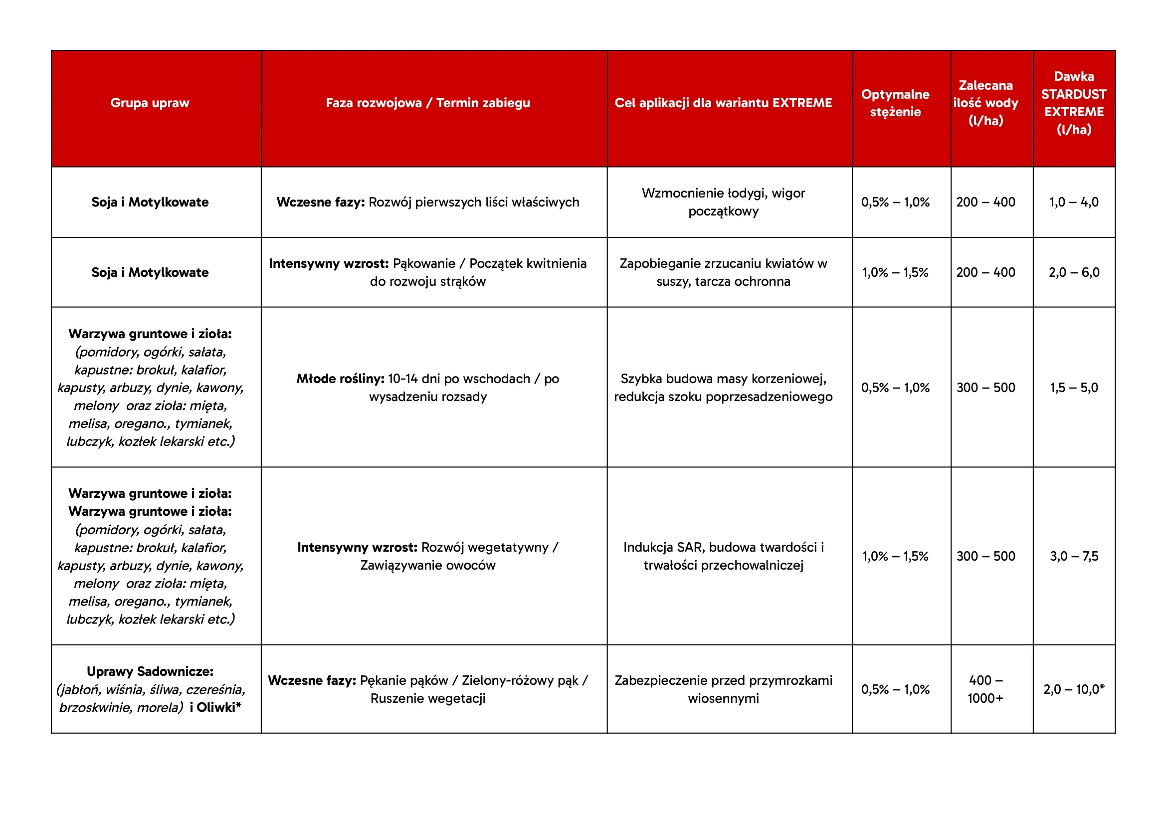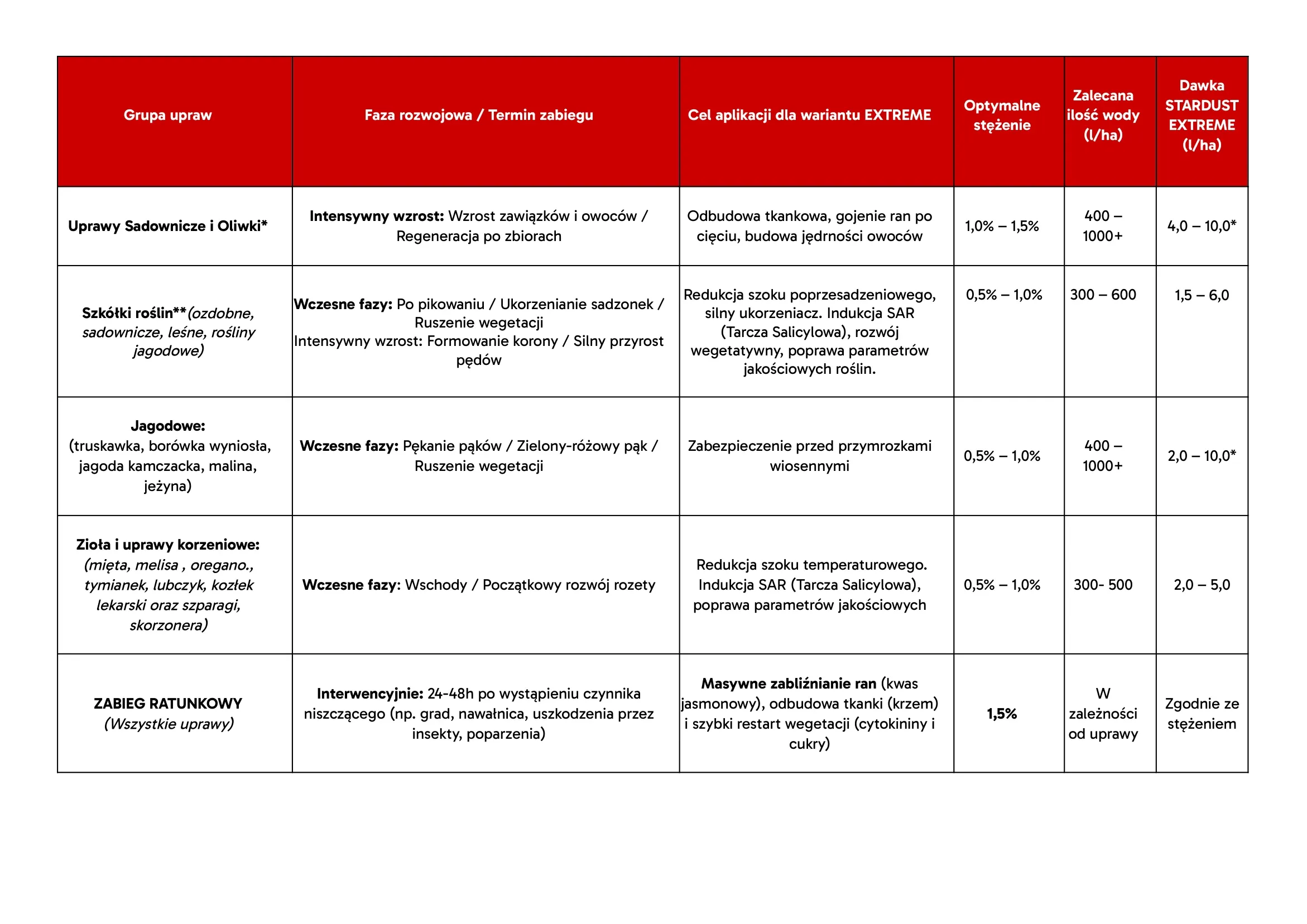 ZABIEG RATUNKOWY (Gradobicie, głęboki stres, insekty, fitotoksyczność): stężenie 1,5% v/v aplikowane interwencyjnie (jedno- lub dwukrotnie w odstępie 5-7 dni).